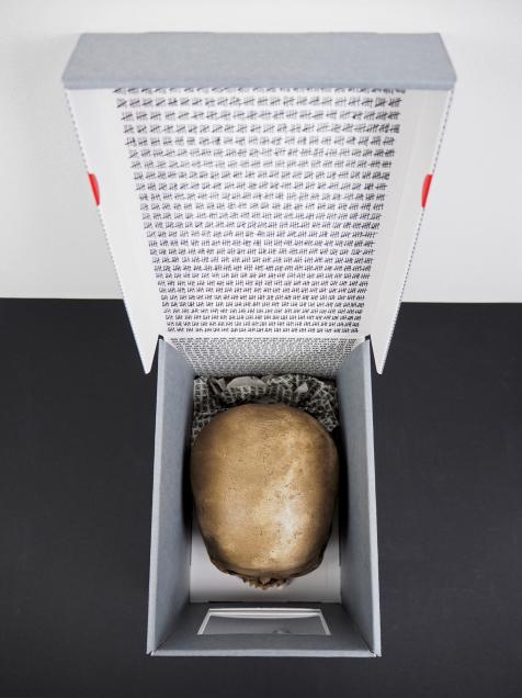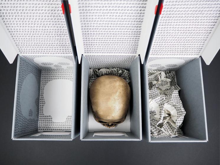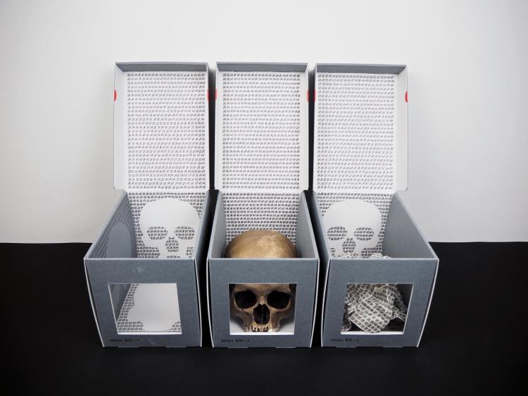 "Boxes of skulls” comprend 3 boîtes de conservation muséale où des crânes ont laissé leurs empreintes définies dans un langage de détention.